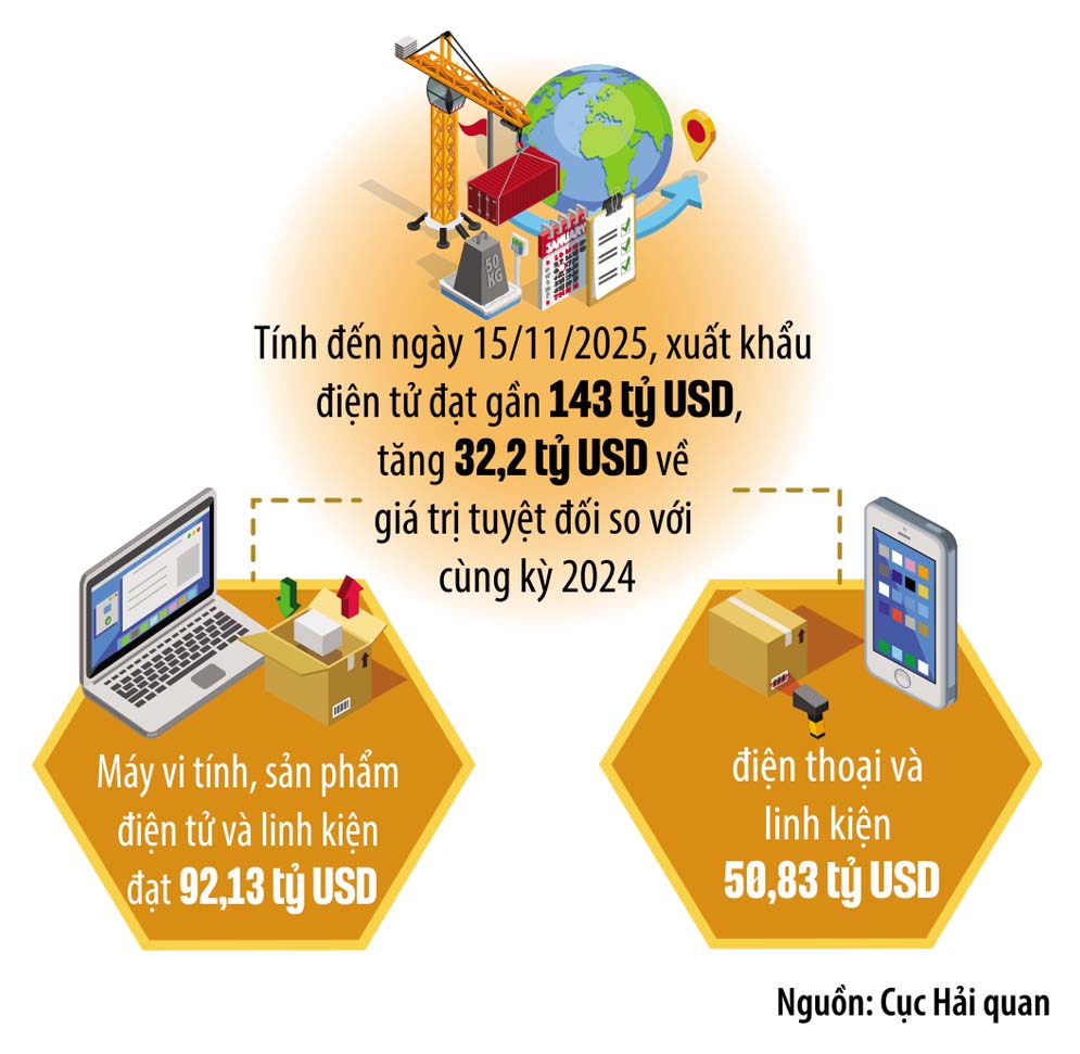 Thống kê sơ bộ của Cục Hải quan cho thấy, tính đến ngày 15/11/2025, tổng trị giá xuất khẩu toàn ngành điện tử đạt gần 143 tỷ USD, trong đó, máy vi tính, sản phẩm điện tử và linh kiện đạt 92,13 tỷ USD, tăng 48,3%, điện thoại và linh kiện 50,83 tỷ USD, tăng 5% so với cùng kỳ năm 2024. Tính về giá trị tuyệt đối, mức tăng thêm của ngành điện tử so với cùng kỳ năm trước lên tới 32 tỷ USD, con số mà trước nay khó ai ngờ tới. Sự gia tăng kỷ lục của điện tử đã dẫn dắt đà tăng trưởng xuất khẩu của cả nước với kim ngạch trên 410 tỷ USD. Nếu so với cả năm 2024, xuất khẩu điện tử hơn 10 tháng qua đã vượt 16,5 tỷ USD.