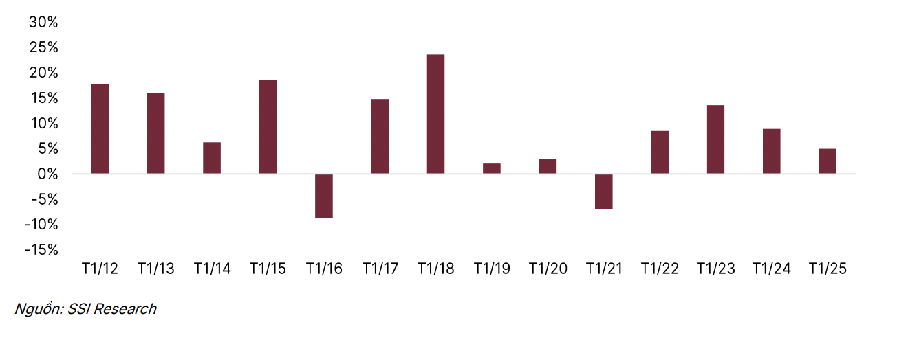 Thị trường có thể chứng kiến các nhịp rung lắc trong mùa báo cáo tài chính vào giai đoạn cuối tháng 1, đặc biệt sau một nhịp hồi phục với mức tăng 18% từ giữa tháng 11/2025 tiến tới mức đỉnh mới vào đầu tháng 1/2026. Tuy nhiên, nhịp điều chỉnh trong giai đoạn này thường nhanh và với mức độ thấp hơn các nhịp điều chỉnh mạnh khác trong năm, ngoại trừ một số năm như 2016, 2018, 2021.