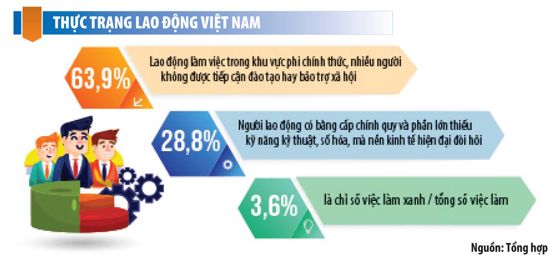 Số liệu thống kê sơ bộ cho thấy, đến quý I/2025, phần lớn lực lượng lao động (63,9%) tại Việt Nam làm việc trong khu vực phi chính thức, nhiều người không được tiếp cận đào tạo hay bảo trợ xã hội. Chỉ 28,8% người lao động có bằng cấp chính quy và phần lớn thiếu kỹ năng kỹ thuật, số hóa mà nền kinh tế hiện đại đòi hỏi. Sự chênh lệch còn rõ rệt hơn ở các vùng nông thôn.