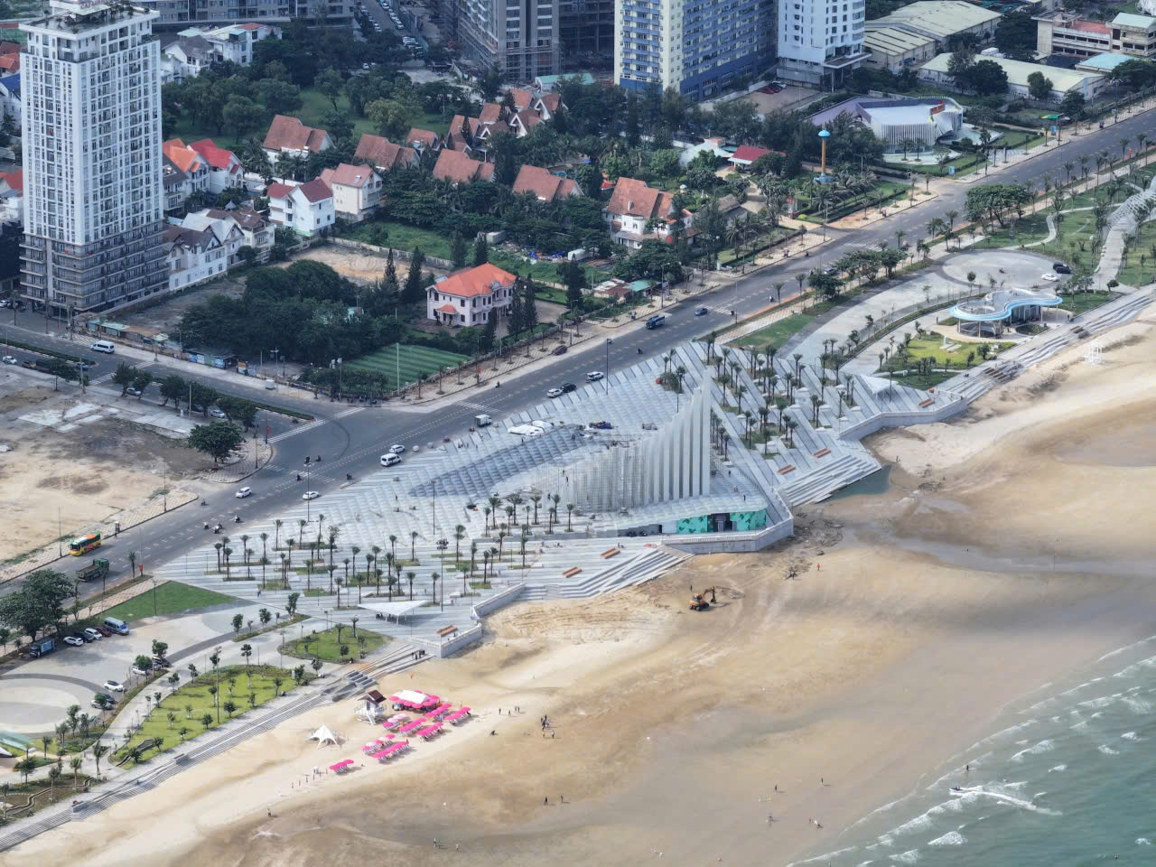 Điểm nhấn kiến trúc của khu vực là Tháp Tam Thắng – công trình mang tính biểu tượng với 143 trụ điêu khắc hướng ra biển, lấy cảm hứng từ ba làng cổ Thắng Nhất, Thắng Nhì và Thắng Tam – cội nguồn hình thành vùng đất Vũng Tàu. Không chỉ là dấu mốc văn hóa – không gian cộng đồng ven biển, Tháp Tam Thắng còn đóng vai trò trục cảnh quan trung tâm, định hình tầm nhìn và trải nghiệm cho các công trình biểu tượng xung quanh.