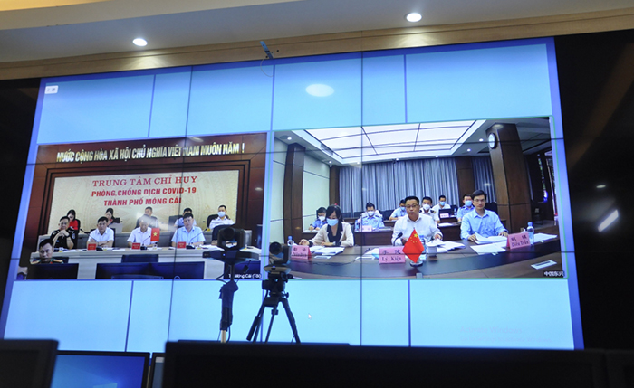 | Lãnh đạo TP. Móng Cái (Việt Nam) và các ngành chức năng hội đàm trực tuyến với chính quyền TP. Đông Hưng Trung Quốc ngày 26/5. Nguồn ảnh: Trung tâm TT&VH Móng Cái. |