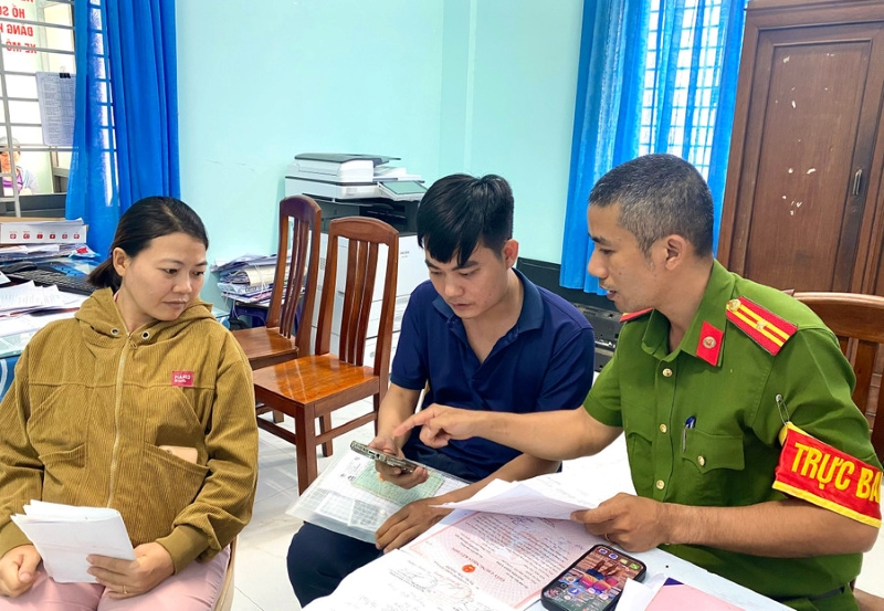 | Cán bộ Công an phường An Nhơn Nam (tỉnh Gia Lai) hướng dẫn, hỗ trợ người dân thực hiện thủ tục đăng ký thường trú cho con qua ứng dụng VNeID. |