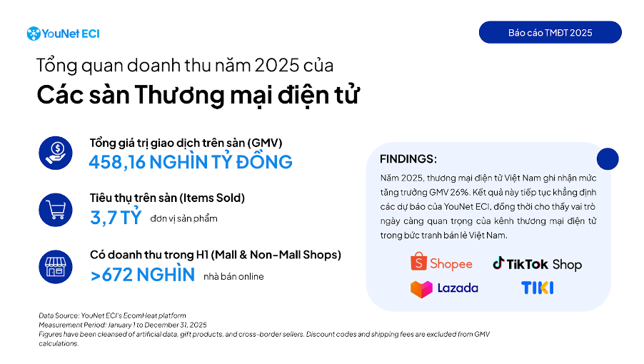 Theo dữ liệu từ báo cáo, năm 2025 ghi nhận tổng giá trị giao dịch (GMV) của 4 nền tảng Shopee, TikTok Shop, Tiki và Lazada đạt 458,16 nghìn tỷ đồng, tăng trưởng 26% so với năm trước. Tốc độ này nhanh hơn so với mức tăng trưởng chung của ngành bán lẻ và dịch vụ tiêu dùng (9,2% - theo Cục Thống kê).