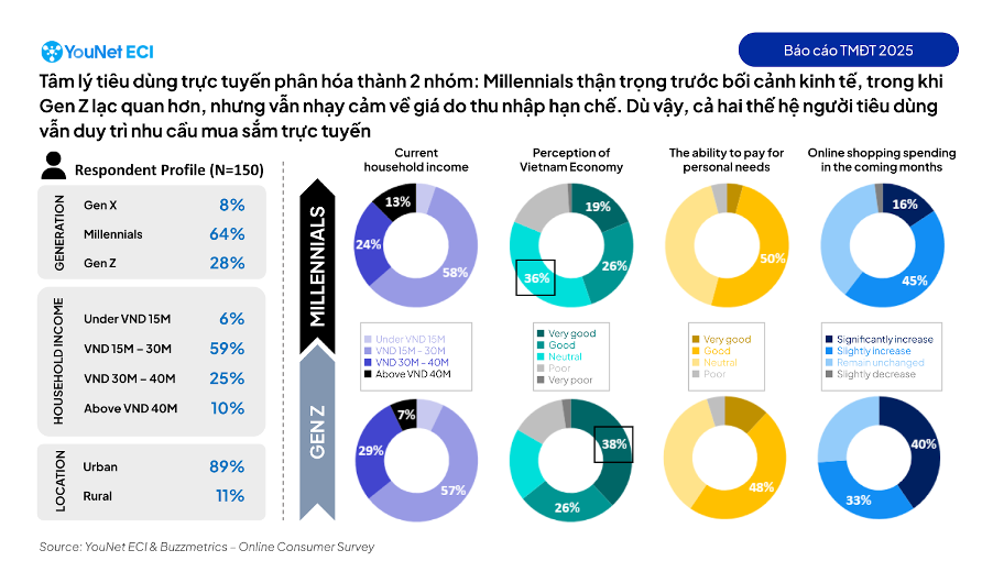 Nếu nhóm Gen Y (Millennials) tỏ ra thận trọng khi đánh giá về kinh tế (36% giữ thái độ trung lập và 45% cảm thấy tích cực) thì nhóm Gen Z lại lạc quan hơn, với 64% cảm thấy tích cực về tình hình kinh tế hiện tại. Tuy nhiên, nhóm Gen Z bị giới hạn bởi khả năng tài chính khi 64% có thu nhập hộ gia đình dưới 30 triệu đồng/tháng.