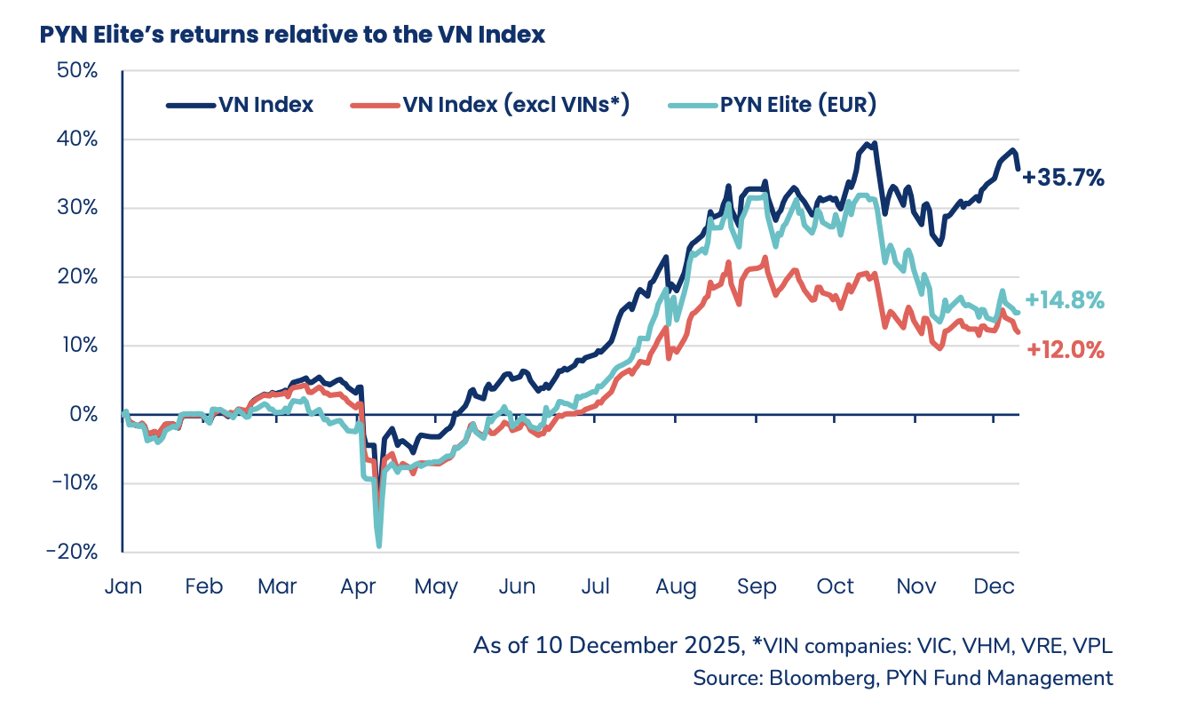PYN Elite Fund cũng không phải là ngoại lệ. Đây là một năm giao dịch đầy thách thức của nhiều quỹ chủ động lớn khác tại Việt Nam. Phần lớn các quỹ này đều không nắm giữ tỷ trọng lớn cổ phiếu Vingroup. Còn ở các quỹ thụ động, danh mục được phân bổ theo tỷ trọng của chỉ số và việc nhóm Vingroup biến động giá nhanh đã tạo nên vị thế quá lớn. Nhưng hoàn toàn có khả năng sau năm 2025, PYN Elite và các quỹ chủ động khác sẽ tiếp tục cạnh tranh được với lợi suất của các quỹ ETF thụ động.