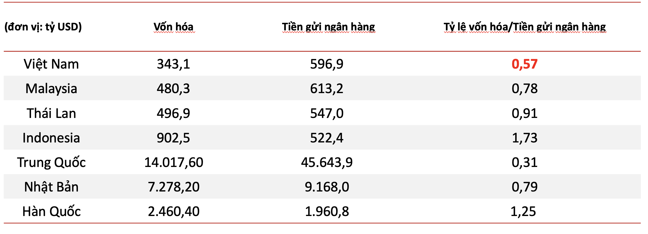 Theo tính toán của SSI, tỷ lệ vốn hóa thị trường cổ phiếu so với tiền gửi ngân hàng hiện chỉ khoảng 0,57, thấp hơn nhiều so với các nước trong khu vực. “Chỉ cần 5% trong tổng tiền gửi dân cư, tương ứng khoảng 15 tỷ USD, dịch chuyển sang chứng khoán, quy mô dòng tiền này đã vượt xa lượng vốn ngoại kỳ vọng từ nâng hạng”, chuyên gia phân tích từ SSI ước tính.