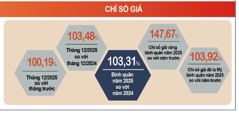 Ở góc độ khác, Cục Thống kê cho biết, lạm phát cơ bản tháng 12/2025 tăng 0,23% so với tháng trước và tăng 3,27% so với cùng kỳ năm trước. Bình quân năm 2025, lạm phát cơ bản tăng 3,21% so với năm trước, thấp hơn mức tăng 3,31% của CPI bình quân chung.