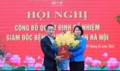 | Lãnh đạo Sở Khoa học và Công nghệ (ngoài cùng bên trái) chúc mừng Bệnh viện Phụ sản Hà Nội. |