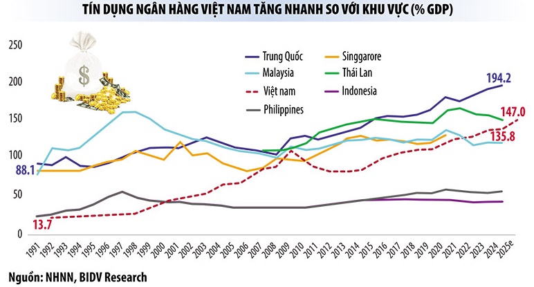 Tính đến cuối năm 2025, tỷ lệ tín dụng/GDP ở Việt Nam lên đến 146% - mức cao nhất trong nhóm các quốc gia có thu nhập trung bình thấp. Theo tính toán của các chuyên gia, nếu tốc độ tăng trưởng tín dụng được duy trì như hiện nay, đến năm 2030, tỷ lệ này có thể lên đến 180-185%, là con số rất đáng lo ngại. Đáng chú ý, khoảng 80% nguồn vốn ngân hàng là ngắn hạn, trong khi 50% dư nợ cho vay là trung, dài hạn, tiềm ẩn rủi ro mất cân đối kỳ hạn.
