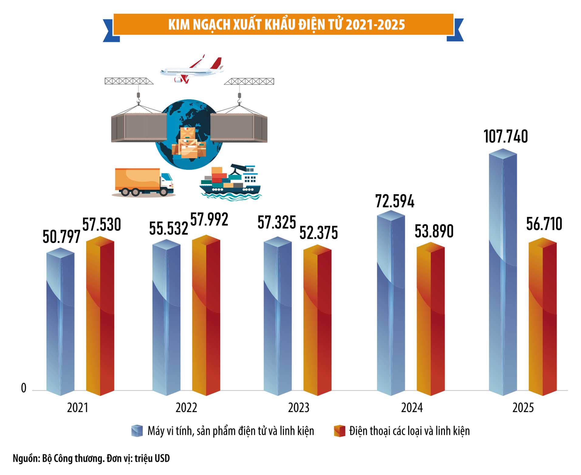 Dữ liệu của Bộ Công thương cho thấy rõ hơn bức tranh sản xuất, xuất khẩu điện tử. Cụ thể, trong 5 năm liên tiếp (2021-2025), kim ngạch xuất khẩu hàng hóa của nước ta đạt trên 1.940 tỷ USD, trong đó nhóm hàng điện tử, công nghệ đóng góp kim ngạch lớn với giá trị gần 623 tỷ USD, chiếm tỷ trọng trên 30% (máy tính, điện tử và linh kiện mang về 343,9 tỷ USD; điện thoại và linh kiện 278,5 tỷ USD).