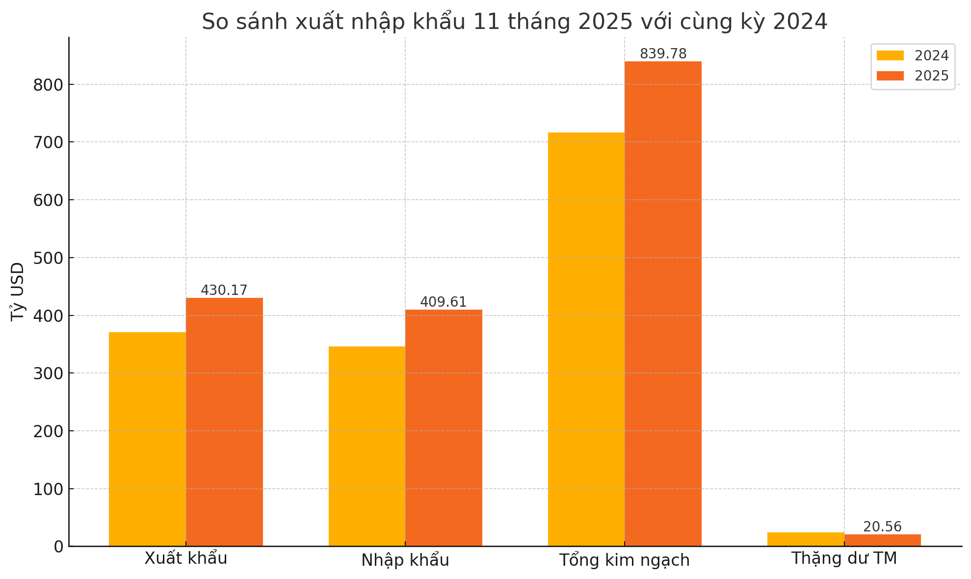 Tổng trị giá xuất nhập khẩu hàng hóa 11 tháng năm 2025 ước đạt 839,78 tỷ USD, tăng 17,2% so với cùng kỳ năm trước, tương ứng tăng 123,41 tỷ USD. Trong đó, xuất khẩu đạt 430,17 tỷ USD, tăng 16,1% (tăng 59,80 tỷ USD); nhập khẩu đạt 409,61 tỷ USD, tăng 18,4% (tăng 63,61 tỷ USD). Cán cân thương mại duy trì thặng dư 20,56 tỷ USD, thấp hơn 15,6% so với mức 24,38 tỷ USD cùng kỳ 2024.