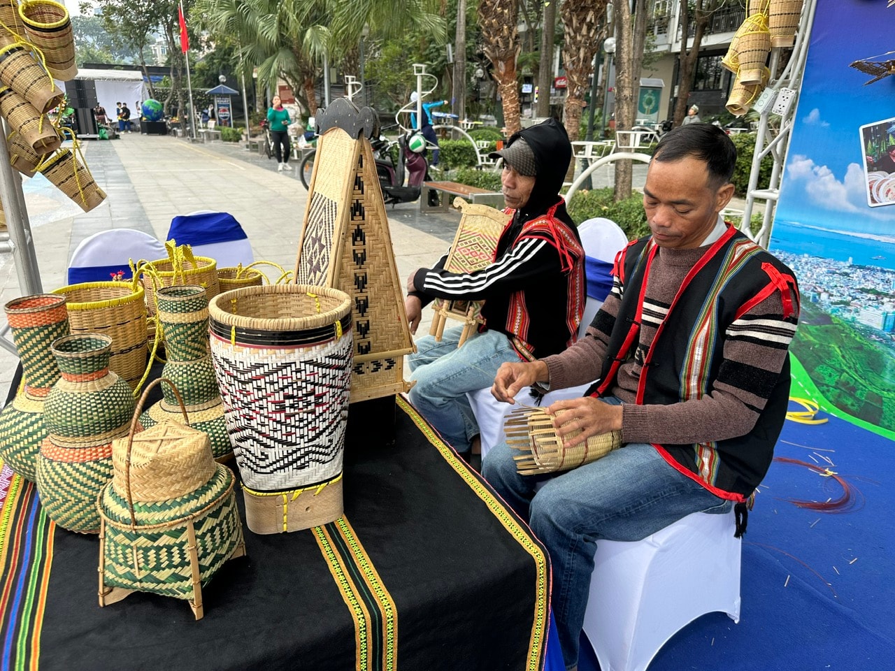 | Các nghệ nhân Gia Lai giới thiệu sản phẩm mây tre thủ công. |