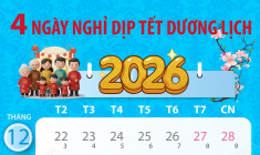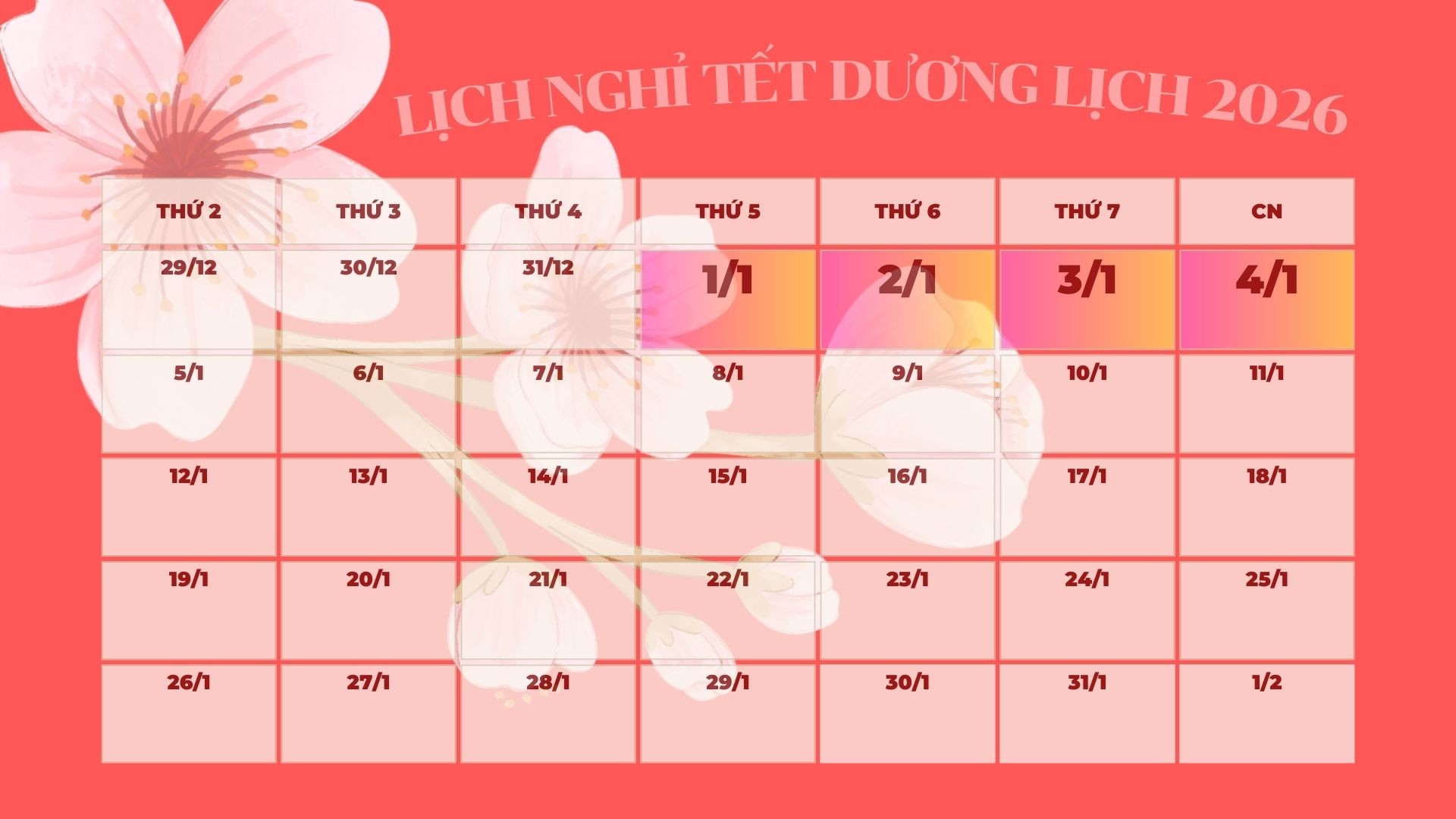 | Công chức, viên chức được nghỉ 4 ngày liên tục từ thứ năm (ngày 1/1/2026) đến hết chủ nhật (ngày 4/1/2026), hoán đổi từ ngày làm việc thứ sáu (ngày 2/1/2026) sang ngày nghỉ hằng tuần thứ bảy (ngày 10/1/2026). |