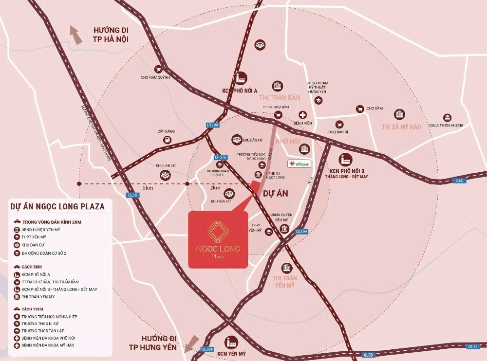 Không chỉ đắc địa về vị trí, Ngọc Long Plaza còn thừa hưởng mạng lưới giao thông hoàn chỉnh, kết nối dễ dàng tới Hà Nội và các tỉnh lân cận thông qua Quốc lộ 5, đường 39 và cao tốc Hà Nội – Hải Phòng. Nhờ ưu thế đó, dự án trở thành cửa ngõ giao thương lý tưởng, vừa thuận tiện cho cư dân địa phương, vừa hấp dẫn với cộng đồng chuyên gia và lực lượng lao động công nghiệp trong khu vực.