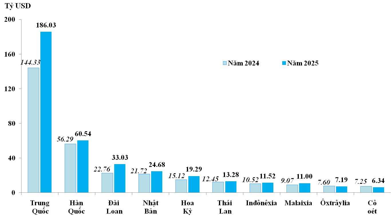 Theo đó, trị giá nhập khẩu từ Đài Loan trong năm 2025 đạt 33,03 tỷ USD, tăng mạnh 45,1%, tương ứng tăng 10,27 tỷ USD so với năm trước.
