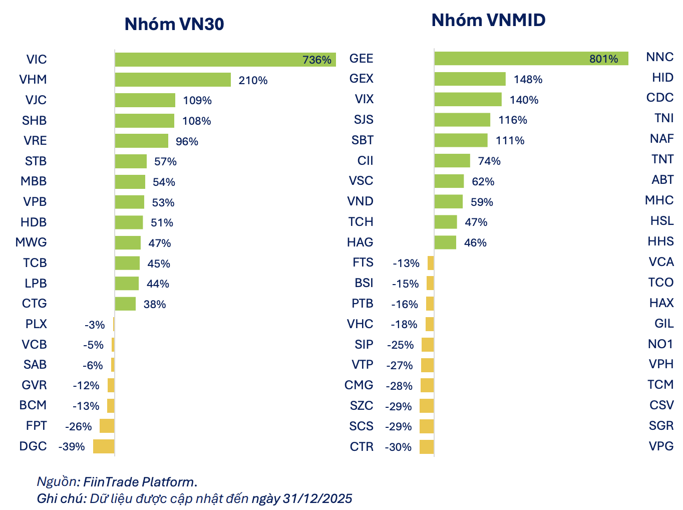 Dòng tiền tập trung mạnh vào nhóm vốn hóa lớn VN30, chiếm tới 50,3% giá trị giao dịch trong cả năm 2025, áp đảo hoàn toàn so với nhóm vốn hóa vừa VNMID (38,7%) và nhỏ VNSML (7,7%). Theo đó, VN30 trở thành động lực tăng trưởng chính của thị trường, trong khi mid-cap tăng khiêm tốn và small-cap (VNSML) gần như đi ngang do không thu hút được dòng tiền.