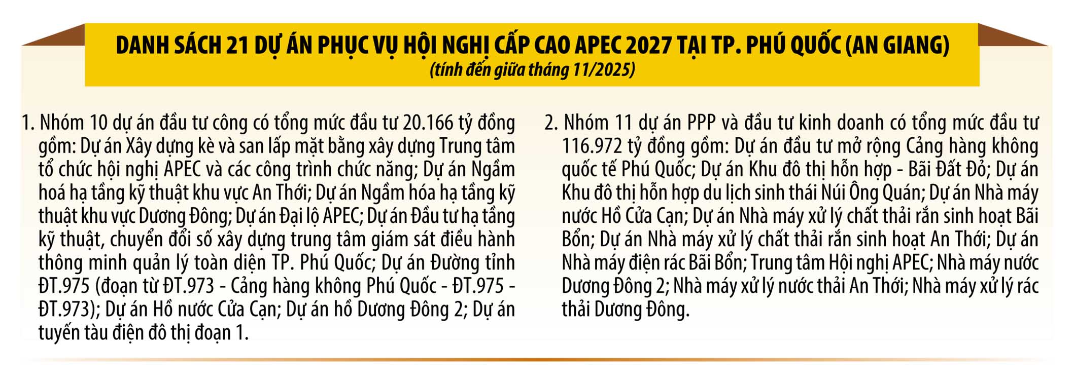 Với tổng mức đầu tư 21.860 tỷ đồng, do Tập đoàn Sun Group thực hiện theo phương thức PPP, cụm công trình Trung tâm Hội nghị APEC xây dựng trên diện tích 28 ha, gồm: Trung tâm hội nghị 3.500 chỗ; Trung tâm báo chí 3.000 chỗ; hệ thống giao thông - hạ tầng kỹ thuật; Khu Quảng trường; bảo tàng; cung văn hóa; cung thiếu nhi; cung triển lãm...