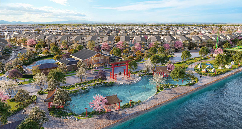 Mỗi biệt thự đều mang dấu ấn Nhật Bản với mái cong Kawara, lam phủ film vân gỗ lấy cảm hứng từ cửa Shoji và lối vào bên hông - chi tiết biểu trưng cho lối sống kín đáo, an nhiên. Hệ tiện ích như biển mặn sau nhà, trà đạo ven hồ, đường thiền và khu BBQ hướng sông tạo nên không gian thư thái và tĩnh tại cho cư dân.