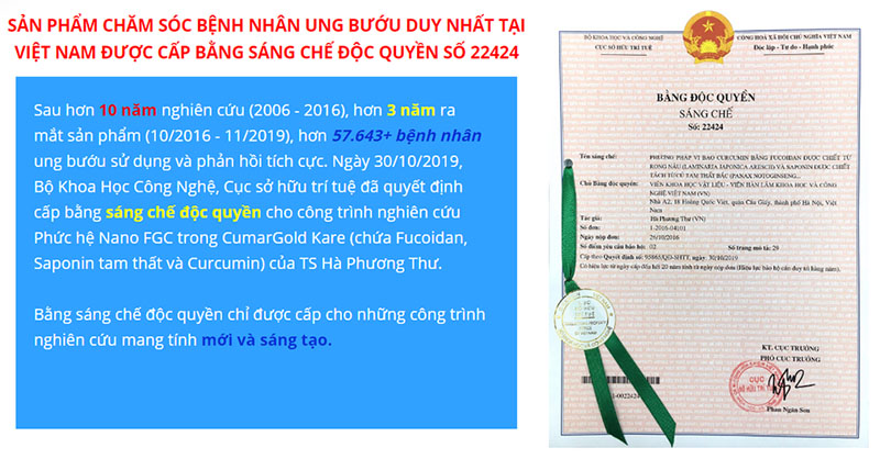 Niềm vui được nhân lên gấp bội khi ngày 30/10/2019, Cục Sở hữu Trí tuệ - Bộ Khoa học và Công nghệ Việt Nam đã chính thức ký quyết định 95865/QĐ-SHTT trao Bằng độc quyền Sáng chế số 22424 cho công trình nghiên cứu về Phức hệ Nano FGC trong CumarGold Kare bởi tính mới, tính sáng tạo trong công nghệ bào chế. Đây là tấm bằng đầu tiên ở Việt Nam được cấp cho 1 công trình nghiên cứu hỗ trợ bệnh nhân ung bướu.