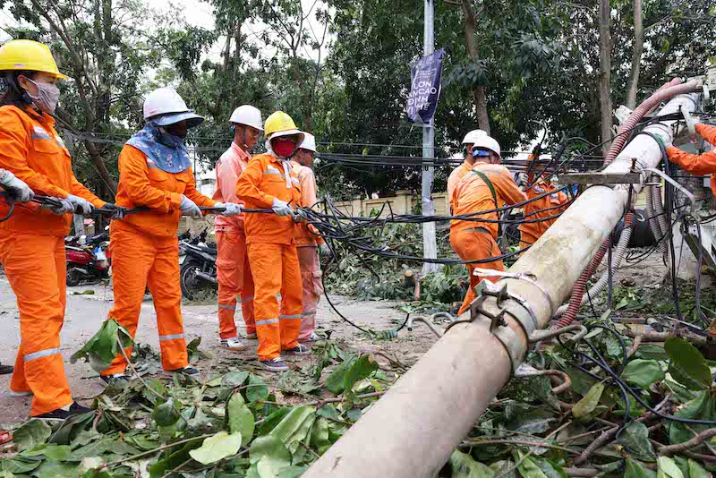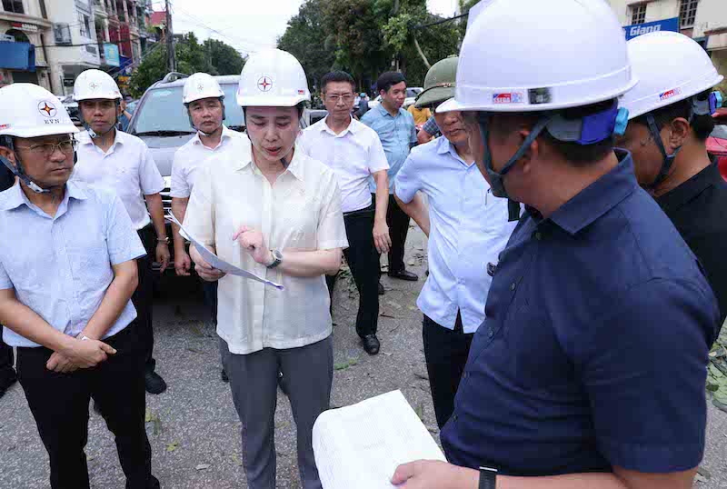 Chủ tịch HĐTV EVNNPC Đỗ Thị Nguyệt Ánh chỉ đạo khắc phục hậu quả sự cố lưới điện do bão số 5 gây ra tại Nghệ An. Ảnh : Vũ Sinh. |
