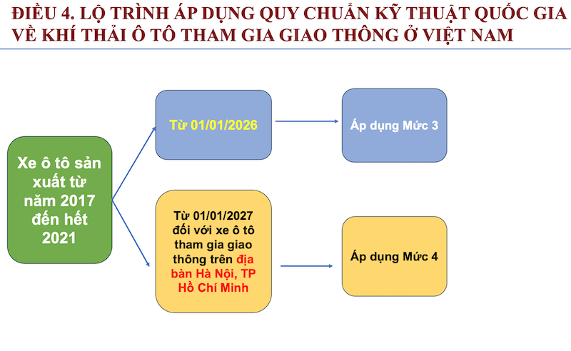 Tại Việt Nam, lộ trình kiểm soát khí thải đang được đẩy mạnh. Kể từ ngày 1/1/2022, tất cả ô tô sản xuất và nhập khẩu mới phải đáp ứng tiêu chuẩn khí thải mức 5. Với các xe sản xuất từ năm 2017, tiêu chuẩn khí thải mức 4 sẽ được áp dụng bắt buộc từ ngày 1/1/2026.
