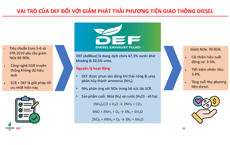 Dung dịch DEF là hợp chất gồm urea có độ tinh khiết cao với các nồng độ chính 32,5%, 40% và 53%, thành phần còn lại là nước cất tinh khiết. Dung dịch DEF không mùi, không độc hại, là chất xúc tác sử dụng cho bộ xử lý khí thải chọn lọc (SCR) của động cơ xe - một công nghệ xử lý khí thải tiên tiến được trang bị trên hầu hết các phương tiện và thiết bị động cơ diesel hiện đại nhằm giảm thải Oxit Nitơ thải ra từ các động cơ diesel.