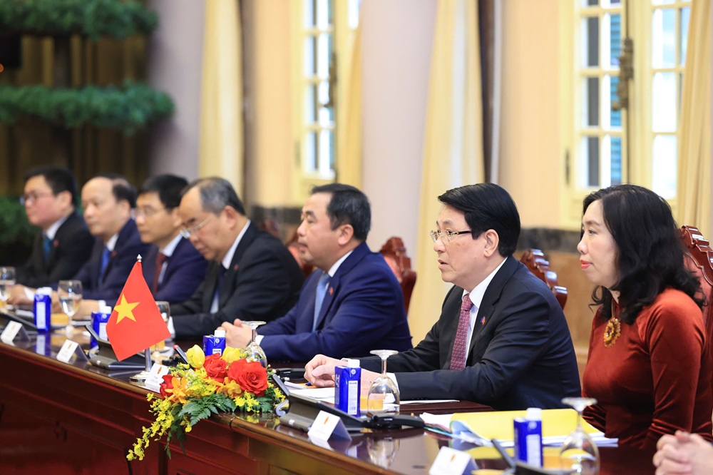 Thông tin tới Chủ tịch Hội đồng Châu Âu những kết quả chính của Đại hội đại biểu toàn quốc lần thứ XIV của Đảng, Chủ tịch nước nhấn mạnh 2 mục tiêu chiến lược 100 năm của Việt Nam: đến năm 2030 trở thành nước đang phát triển có công nghiệp hiện đại, thu nhập trung bình cao và đến năm 2045 trở thành nước phát triển, thu nhập cao; quyết tâm của Việt Nam xây dựng mô hình tăng trưởng mới dựa trên khoa học - công nghệ, đổi mới sáng tạo, chuyển đổi số và chuyển đổi xanh là một trong những nhiệm vụ trọng tâm. Chủ tịch nước khẳng định Việt Nam sẵn sàng cùng EU tiếp tục đồng hành trong kỷ nguyên phát triển mới.