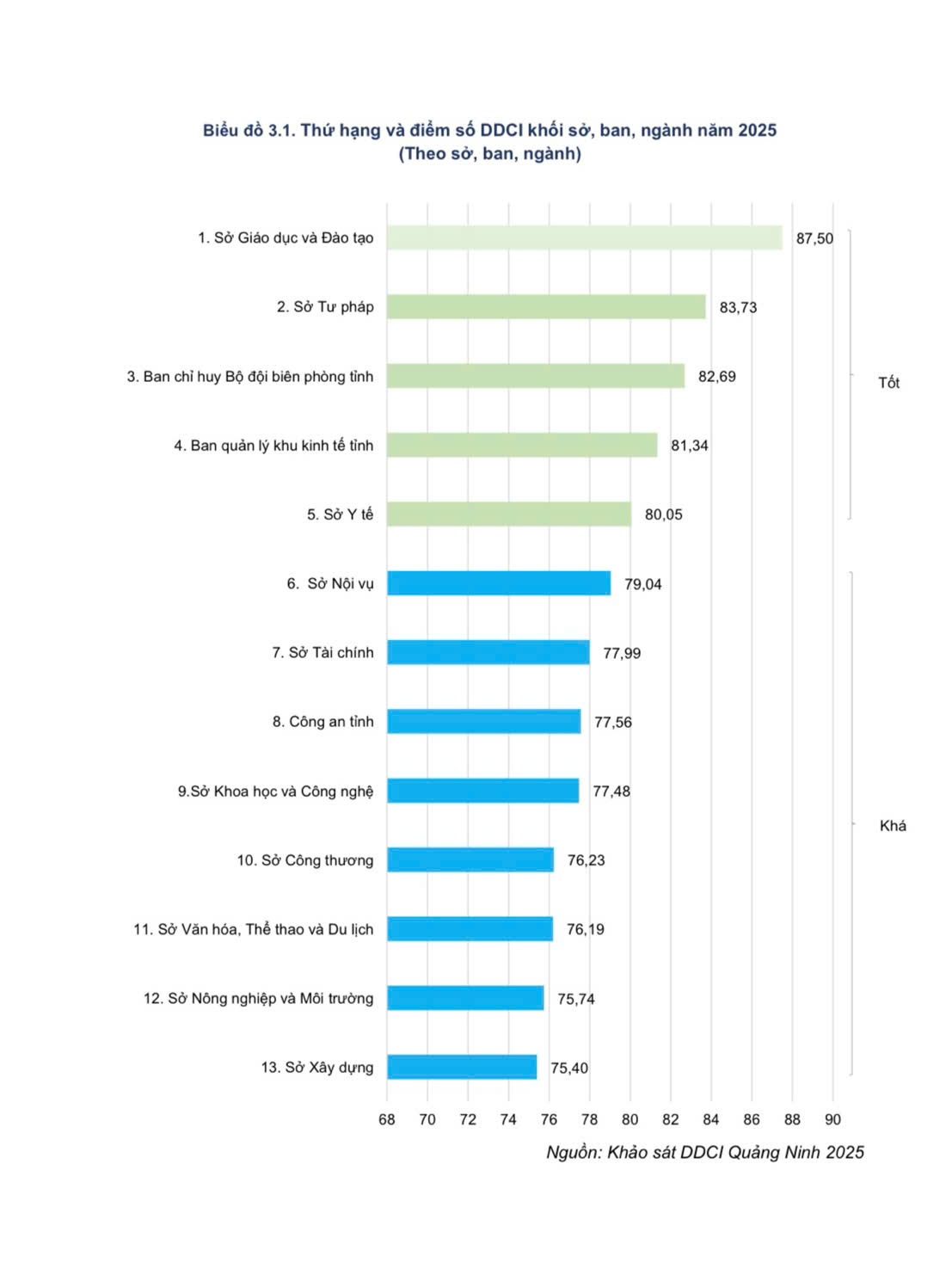 | Thứ hạng và điểm số DDCI khối sở, ban, ngành của tỉnh Quảng Ninh năm 2025. |