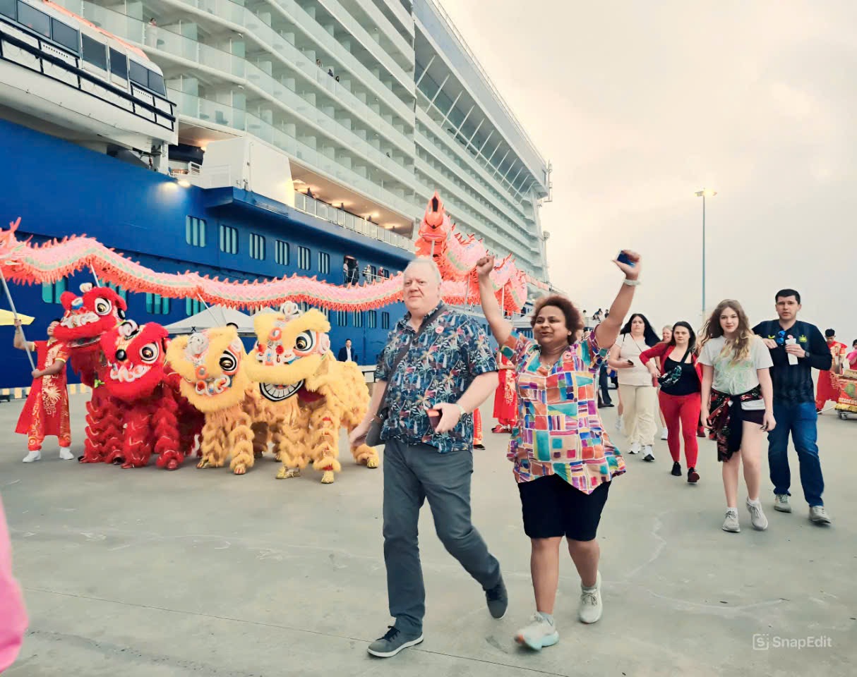 Ngay sau khi cập cảng, đại diện lãnh đạo tỉnh Quảng Ninh, Sở Du lịch Quảng Ninh cùng Ban Quản lý Cảng tàu khách quốc tế Hạ Long đã có những bó hoa tươi thắm chào mừng những du khách đầu tiên đến với Quảng Ninh đầu năm mới 2026.