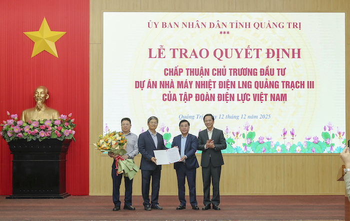 | Lãnh đạo UBND tỉnh Quảng Trị trao Quyết định chấp thuận chủ trương đầu tư Dự án Quảng Trạch III cho EVN. |