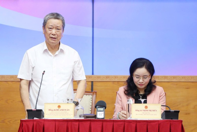 | Thứ trưởng Bộ VHTTDL Trịnh Thị Thuỷ và Chủ tịch Hiệp hội Phát triển Văn hóa Doanh nghiệp Việt Nam Hồ Anh Tuấn chủ trì buổi họp báo. Ảnh: Trần Huấn. |