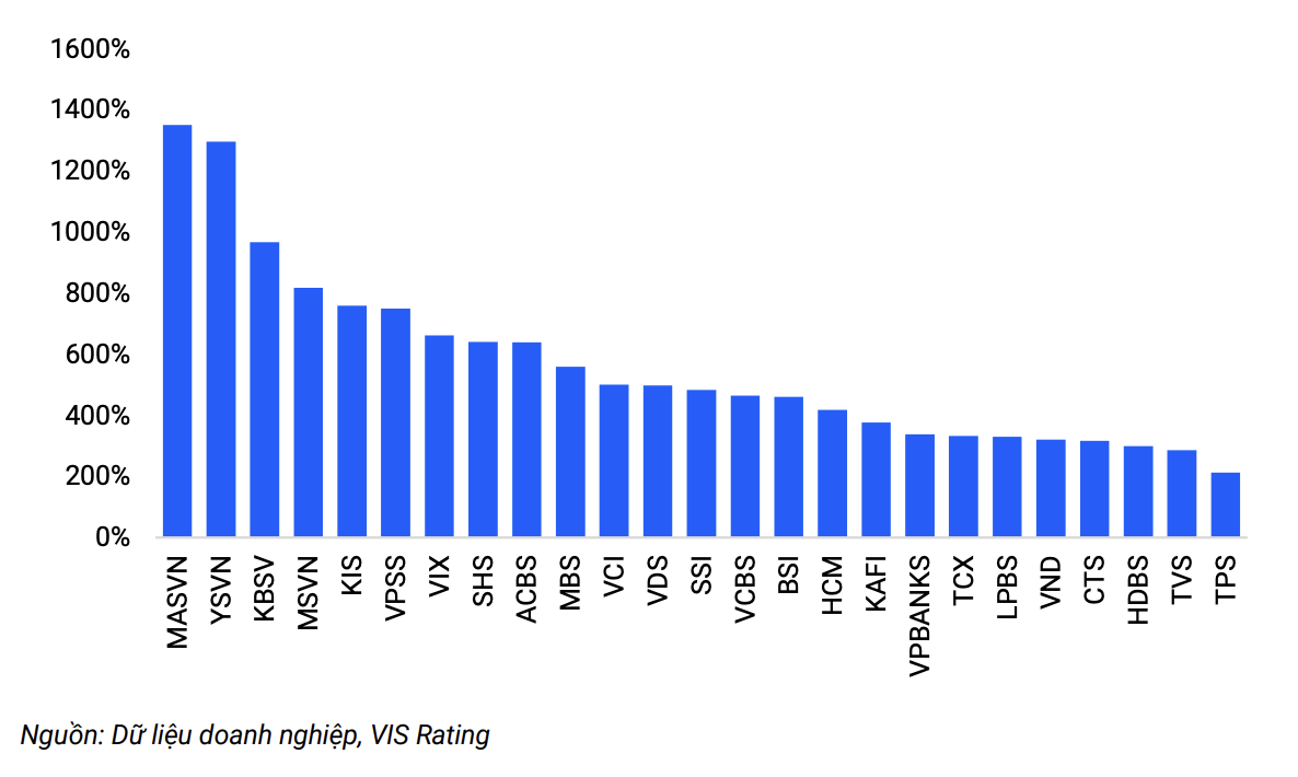 Các công ty tập trung vào cho vay ký quỹ (ví dụ như MBS) và tự doanh cổ phiếu có thanh khoản cao như SHS vẫn có vị thế tốt, với tỷ lệ an toàn tài chính dao động từ 550% đến 650% trong 6 tháng 2025. Trong khi đó, các công ty nắm giữ nhiều trái phiếu doanh nghiệp như VNDirect, TPS đang tích cực tăng vốn để nâng cao khả năng hấp thụ tổn thất và hỗ trợ đà tăng trưởng.