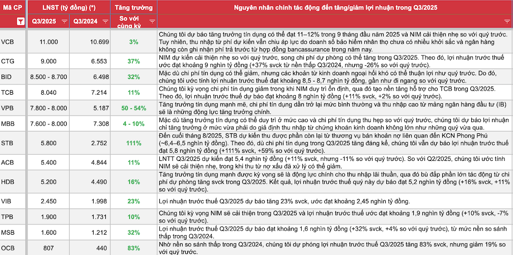 Lợi nhuận quý III của các ngân hàng được dự báo đồng loạt tăng trưởng so với cùng kỳ. |