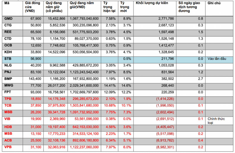 MBS ước tính, các cổ phiếu được tăng tỷ trọng đáng chú ý bao gồm GMD, STB, CTD, ngược lại các cổ phiếu giảm tỷ trọng gồm có VPB, ACB, MSB.