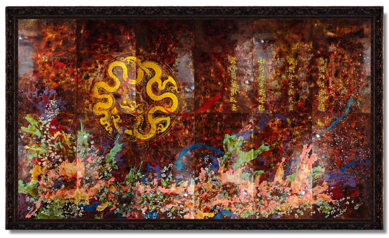 Việc sử dụng các chất liệu truyền thống như gỗ mít, tơ tằm, sơn mài, vàng lá, vỏ trứng và kỹ thuật hom đất tạo nên chiều sâu văn hóa, đồng thời phản ánh triết lý cân bằng âm dương. Khép lại hành trình là bức sơn mài khổ lớn kích thước 6,5m x 4m, nơi hình ảnh trăm trứng trong truyền thuyết Âu Cơ được tái hiện, như một ẩn dụ về sinh thành, tan rã và tái sinh.