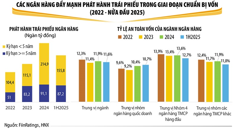 Khó khăn trong việc tăng vốn cấp 1 khiến thời gian qua, các ngân hàng phải tăng mạnh phát hành trái phiếu để tăng vốn cấp 2. Tuy vậy, Hệ số an toàn vốn (CAR) của nhóm ngân hàng quốc doanh vẫn ở mức thấp (hơn 10%) và áp lực tăng vốn lõi khi Thông tư 14/2025/TT-NHNN của Ngân hàng Nhà nước có hiệu lực là rất lớn.