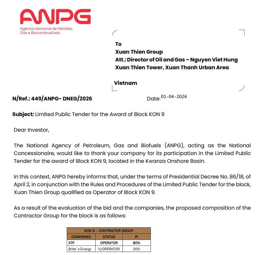 Thông báo chính thức của ANPG về việc Xuân Thiện được chọn là nhà thầu điều hành lô dầu khí KON9 tại Angola. |
