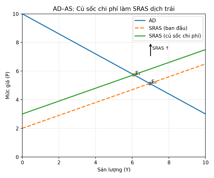 Trong mô hình AD-AS, diễn biến này cho thấy đường tổng cung ngắn hạn đang dịch chuyển sang trái khi chi phí sản xuất tăng làm giảm sản lượng thực trong khi mức giá chung tăng lên. Đây là biểu hiện điển hình của lạm phát chi phí đẩy, trong đó áp lực giá không xuất phát từ tổng cầu quá mạnh mà từ sự gia tăng chi phí đầu vào. Trong bối cảnh này, việc sử dụng chính sách tiền tệ để kiểm soát lạm phát trở nên kém hiệu quả hơn, bởi lãi suất không tác động trực tiếp đến các yếu tố như giá năng lượng hay chi phí logistics.