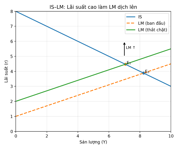 Tại Mỹ, Feb tiếp tục duy trì lãi suất điều hành ở mức cao. Trong mô hình IS-LM, điều này phản ánh một trạng thái tiền tệ thắt chặt, thường gắn với việc kiểm soát chặt cung tiền và thanh khoản trong nền kinh tế. Khi cung tiền thực bị hạn chế, đường LM dịch chuyển lên trên, làm tăng lãi suất cân bằng, qua đó làm giảm đầu tư tư nhân và kéo sản lượng cân bằng xuống.