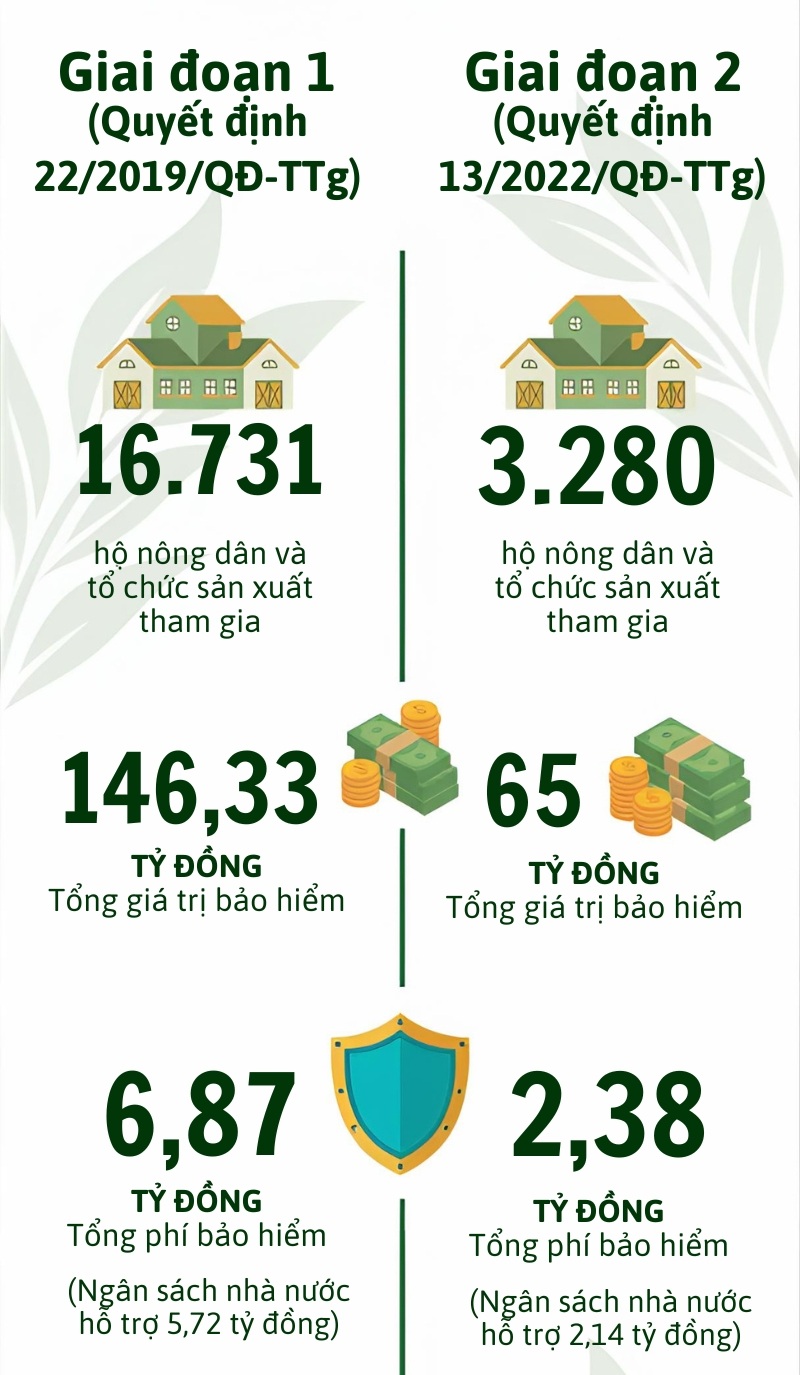 Ở giai đoạn tiếp theo theo Quyết định số 13/2022/QĐ-TTg, có 3.280 hộ và tổ chức tham gia bảo hiểm nông nghiệp với tổng giá trị bảo hiểm khoảng 65 tỷ đồng. Tổng phí bảo hiểm đạt 2,38 tỷ đồng, trong đó ngân sách nhà nước hỗ trợ khoảng 2,14 tỷ đồng. Phạm vi đối tượng được hỗ trợ cũng từng bước được mở rộng sang nhiều loại cây trồng, vật nuôi và thủy sản hơn.