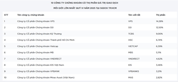 Thị phần môi giới HOSE quý IV/2025: Nhóm đầu thu hẹp khoảng cách, VPBankS xuất hiện -