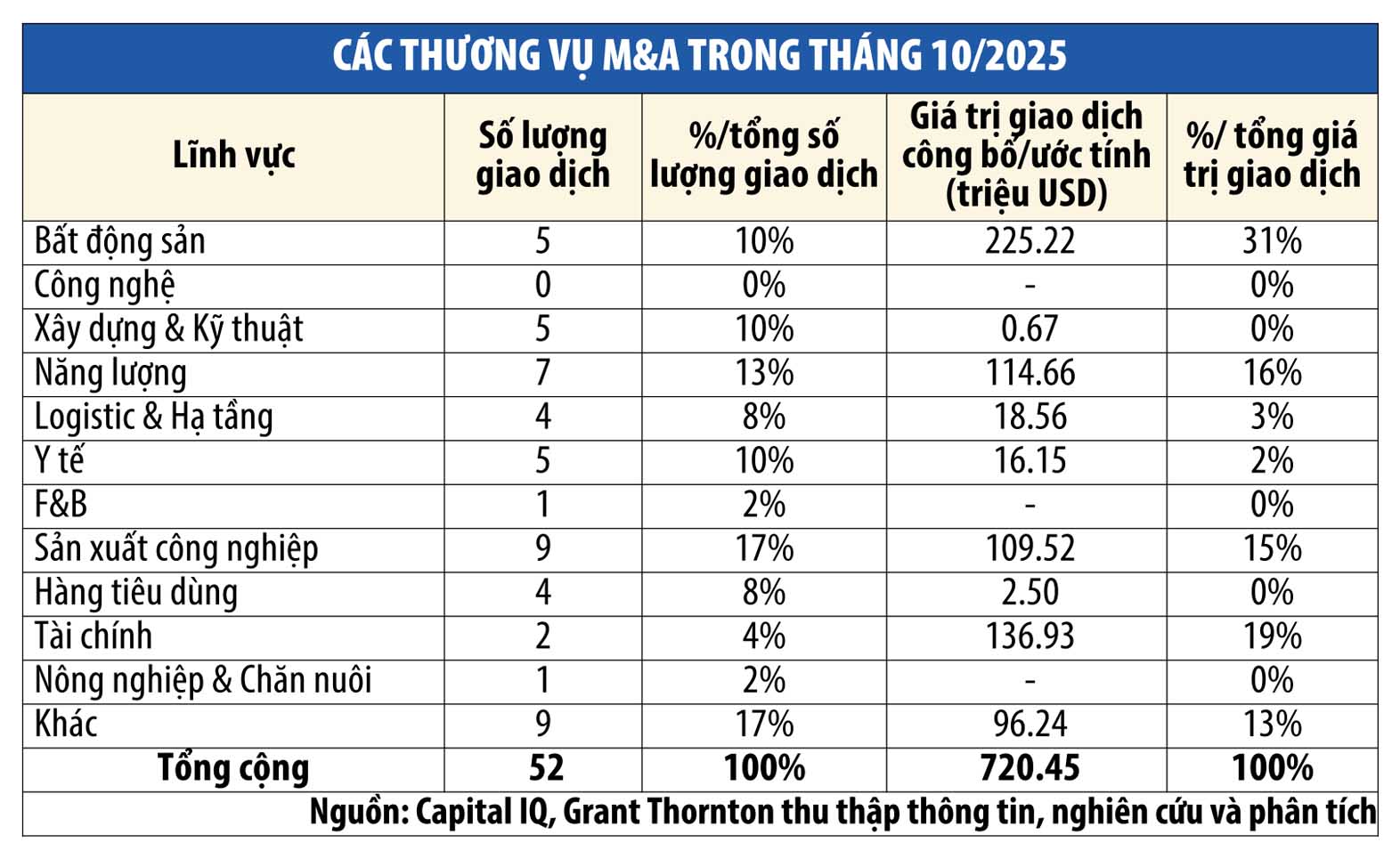 Mặc dù tổng giá trị giao dịch trong tháng 10 gần tương đương với tháng 9, số lượng và cấu trúc các thương vụ lại cho thấy tín hiệu phục hồi rõ ràng hơn của thị trường M&A.