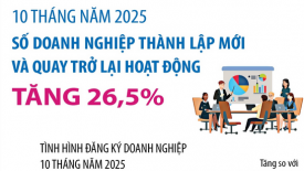 Số doanh nghiệp thành lập mới và quay trở lại hoạt động tăng 26,5% sau 10 tháng năm 202510 tháng năm 2025, cả nước có 162,9 nghìn doanh nghiệp đăng ký thành lập mới (tăng 19,7%) và 92,9 nghìn doanh nghiệp quay trở lại hoạt động (tăng 40,3%), nâng tổng số doanh nghiệp thành lập mới và quay trở lại hoạt động lên 255,9 nghìn doanh nghiệp, tăng 26,5% so với cùng kỳ năm 2024. -