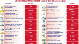 Giai đoạn 2026 - 2030, Chính phủ đặt mục tiêu đưa tốc độ tăng trưởng GDP bình quân/năm lên trên 10%; GDP bình quân đầu người đạt 8.500 USD; Tỷ trọng kinh tế số trong GDP đạt 30%; 100% người dân được hưởng chính sách khám sức khỏe hằng năm; Có 19 bác sĩ trên 1 vạn dân; Tỷ lệ giảm phát thải nhà kính 8 - 9%...