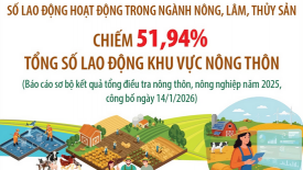 Lao động hoạt động trong ngành nông, lâm, thủy sản chiếm 51,94% tổng số lao động khu vực nông thônTheo báo cáo sơ bộ kết quả tổng điều tra nông thôn, nông nghiệp năm 2025, thời điểm 1/7/2025, số lao động hoạt động trong ngành nông, lâm nghiệp và thủy sản chiếm 51,94% tổng số lao động khu vực nông thôn cả nước, giảm 4,36 điểm phần trăm so với năm 2016; tỷ trọng lao động phi nông, lâm nghiệp và thủy sản chiếm 48,06% (năm 2016 chiếm 43,7%)… -