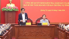 Công bố quyết định kiểm tra, giám sát đối với Ban Thường vụ Tỉnh ủy Quảng TrịSáng 4/3, Đoàn kiểm tra, giám sát số 27 của Ban Chấp hành Trung ương Đảng tổ chức hội nghị công bố quyết định kiểm tra, giám sát năm 2026 của Bộ Chính trị, Ban Bí thư đối với Ban Thường vụ Tỉnh ủy Quảng Trị.