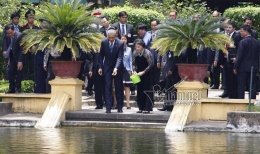 Tổng thống Mỹ Obama cho cá ăn tại khu nhà sàn Bác Hồ