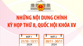 Những nội dung chính của Kỳ họp thứ 8, Quốc hội khóa XVKỳ họp thứ 8, Quốc hội khóa XV họp phiên trù bị và khai mạc trọng thể vào ngày 21/10/2024, dự kiến bế mạc vào sáng 30/11/2024, theo hình thức họp tập trung tại Nhà Quốc hội, Thủ đô Hà Nội. Kỳ họp được tiến hành theo 2 đợt: Đợt 1 từ ngày 21/10 đến hết ngày 13/11; Đợt 2 từ ngày 20/11 đến sáng 30/11, trong đó Quốc hội sẽ làm việc 4 ngày thứ bảy. -