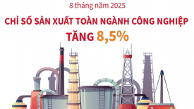 8 tháng năm 2025, chỉ số sản xuất công nghiệp tăng 8,5% so với cùng kỳ năm 2024. Trong đó, ngành chế biến, chế tạo tăng 10,0%; ngành cung cấp nước, hoạt động quản lý và xử lý rác thải, nước thải tăng 9,1%; ngành sản xuất và phân phối điện tăng 4,9% và ngành khai khoáng giảm 1,1%.