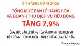 Tổng mức bán lẻ hàng hóa và doanh thu dịch vụ tiêu dùng tăng 7,9% sau 2 tháng năm 20262 tháng năm 2026, tổng mức bán lẻ hàng hóa và doanh thu dịch vụ tiêu dùng theo giá hiện hành ước đạt 1.236,6 nghìn tỷ đồng, tăng 7,9% so với cùng kỳ năm trước. Trong đó, doanh thu Bán lẻ hàng hóa tăng 7,8%, doanh thu dịch vụ lưu trú, ăn uống tăng 9,1%, doanh thu du lịch lữ hành tăng 12,2%... -